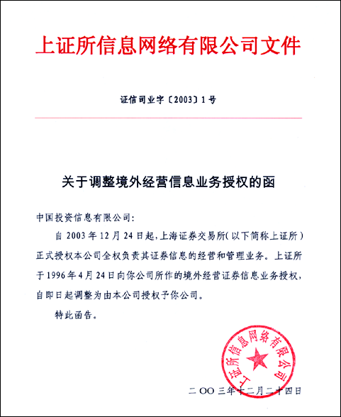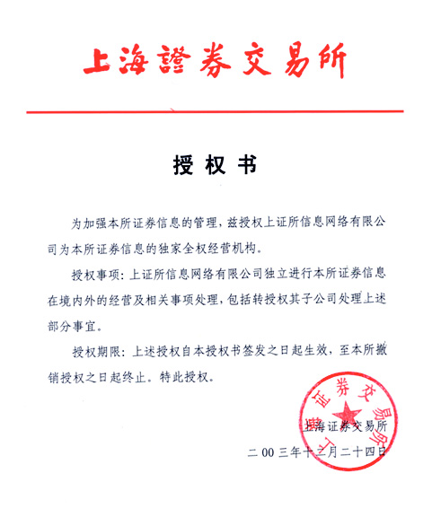 二、上海證券交易所、深圳證券交易所分別于2003年12月24日、1998年6 月12日授權上證所信息網(wǎng)絡有限公司、深圳證券信息有限公司為各自證券信息的獨家全權經(jīng)營機構(gòu),上海證券交易所、深圳證券交易所對其他有關機構(gòu)經(jīng)營證券信息的所有授權均已到期,宣告終止。